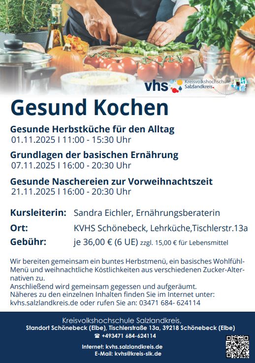 Schönebeck. Um ein gutes Lebensgefühl geht es letztlich auch bei Kochkursen mit einer Ernährungsberaterin in der KVHS am Standort Schönebeck. Auf dem aktuellen Plan stehen am 1. November, 11 – 15.30 Uhr, ein buntes Herbstmenü, am 7. November, 16 – 20.30 Uhr, ein basisches Wohlfühlmenü und am 21. November von 16 bis 20.30 Uhr die Zubereitung gesunder Naschereien zur Vorweihnachtszeit aus verschiedenen Zuckeralternativen.